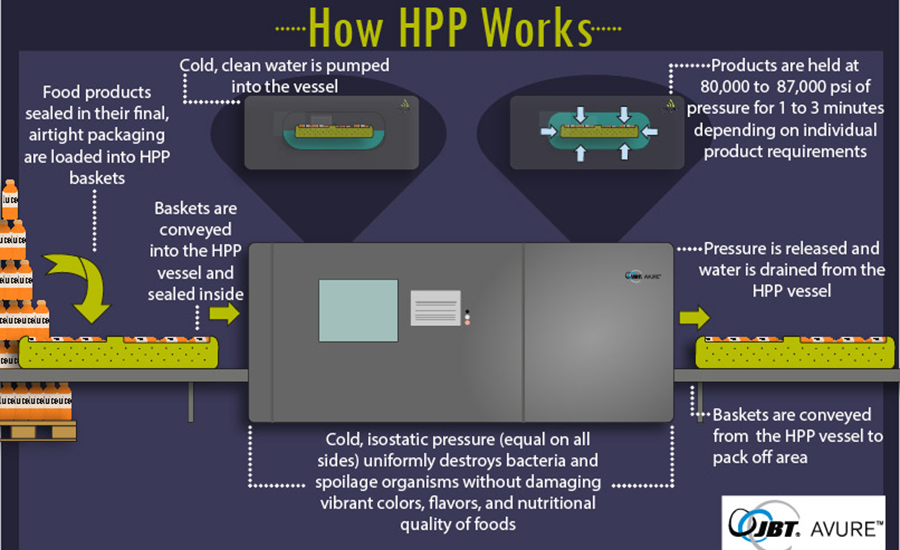 This infographic shows the process behind HPP. People looking for minimally processed foods may opt for brands that use HPP because it doesn't use thermal pasteurization, which can alter the product and its health benefits. Courtesy of JBT-Avure